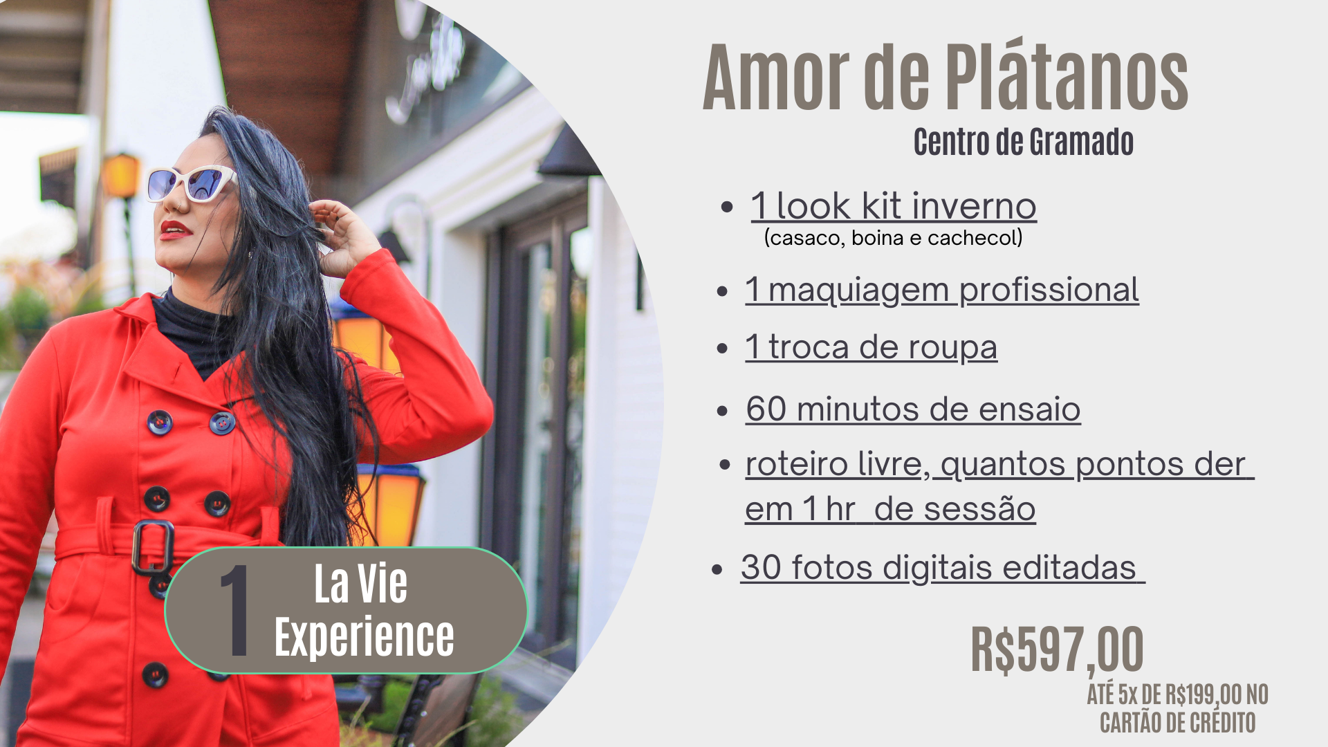 ideal para turistas que desejam um ensaio com produção visual e figurino. Nesse pacote, você vai fazer as fotos mais lindas da sua vida, no centro de Gramado.