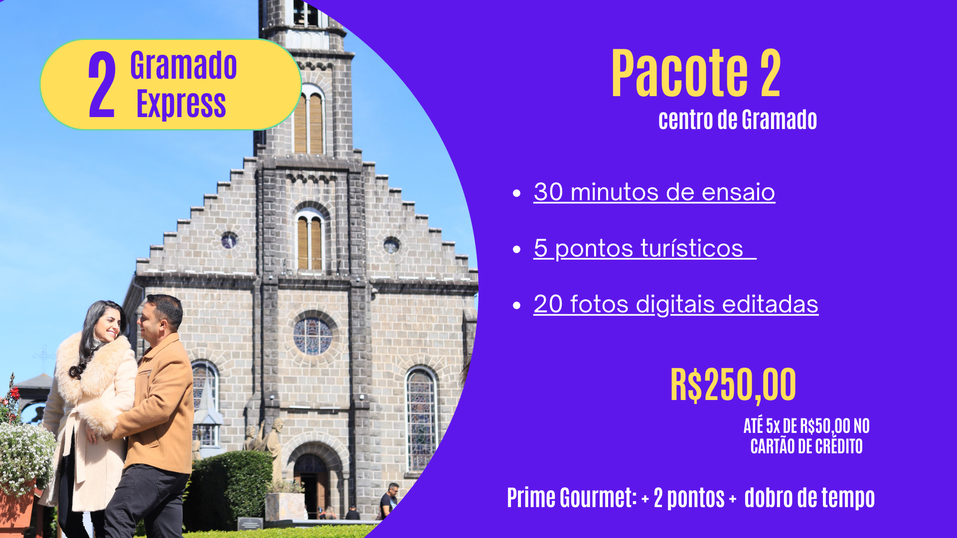 ideal para turistas que desejam economizar tempo e dinheiro, mas que ama fotos, o pacote 2 do Gramado Express tem a proposta de apenas 30 minutos em 5 pontos turisticos no centro de Gramado, entregando 20 lindas fotos de recordação.